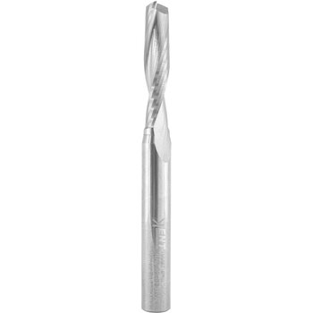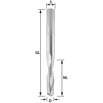 Nutfräser aus Vollhartmetall mit geschliffener Spirale zum besseren Spanauswurf. Durch die spiralförmig geschliffene Schneide arbeitet der Fräser mit ziehendem Schnitt und erzeugt eine saubere Fräskante. Ebenso kann mit weniger Druck auf das Werkzeug gearbeitet werden, was gleichzeitig die Bruchgefahr verringert. Ausführung mit zwei Schneiden.